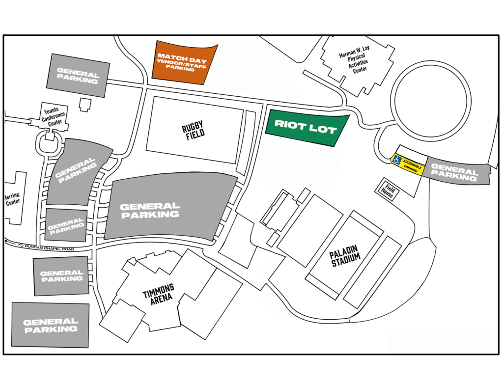 For easiest access, enter through the Timmons Arena entrance off Duncan Chapel road and follow signage. All lots open two hours prior to kickoff. Pay-at-entrance parking is available on match day with cash or credit cards for $5. Riot members will enter from Dins Dr. off Duncan Chapel Rd.